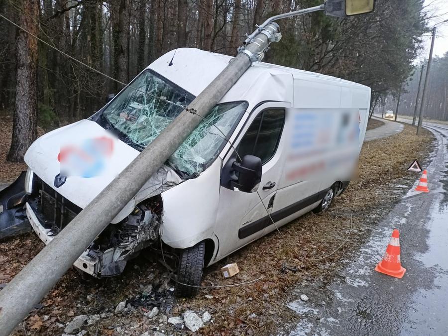 Kierujący samochodem dostawczym marki Renault stracił panowanie nad pojazdem na łuku drogi i uderzył w słup oświetleniowy. Latarnia przewróciła się na auto. Na szczęście 38-letni kierowca nie odniósł obrażeń. Na miejscu interweniowały służby.